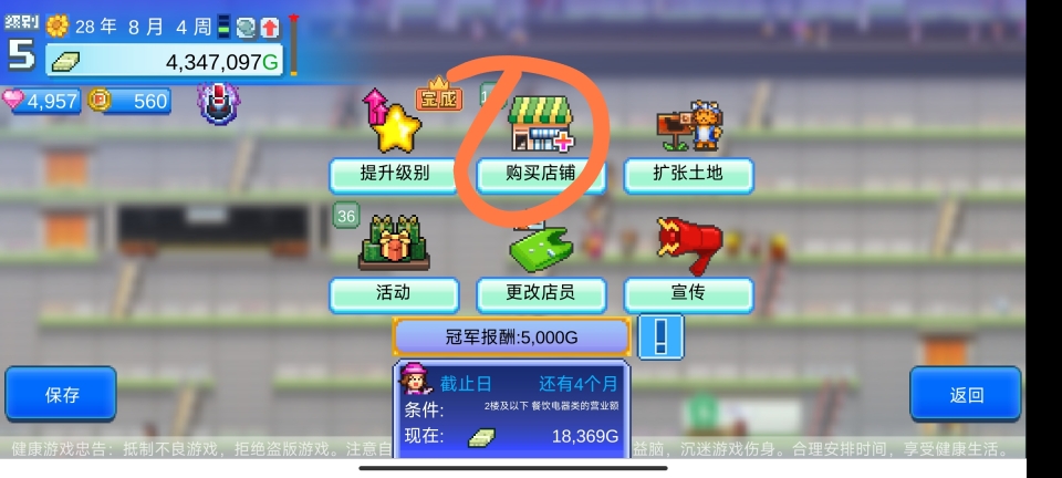 本作的前三星提升星级比较简单,困难在于提升至四星与五星(游戏硬性要求,会比较耗时费力,且没有什么很好的办法提速),因此玩家将会在三星卡很久,只能建设部分的建筑和专柜楼层是正常现象,所以一星-三星的专柜楼层的设置非常重要,收入的提升也主要在此过程中逐渐提升,在达成四星后游戏便会简单不少
