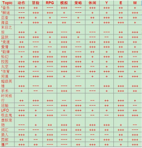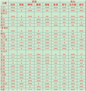 游戏开发大亨最佳搭配表,表中红色代表不可行,绿色代表完美,黄色代表中等