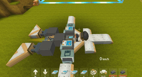 14、这样一个简易的飞机就制作完毕啦!生成载具后尝试一下,首先坐上飞机,按下推进按键: