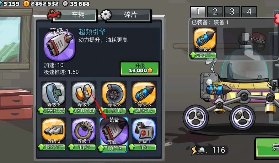 登山赛车2怎么更换装备?