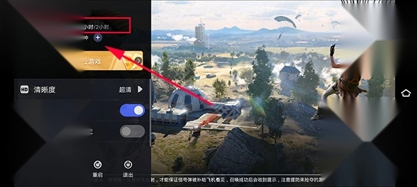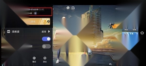 3、登录成功后,点击打开左侧的悬浮窗,就能查看自己的游戏时长,图中显示的加号按钮可以用来充值或免费领取游戏时长;