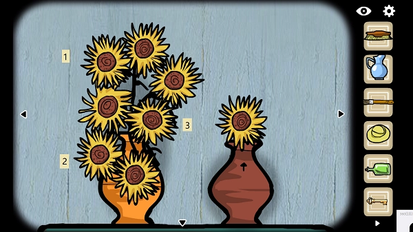 按照图示的顺序,依次点击左侧花瓶里的三朵向日葵(从左到右),右侧窗台上那株正在缓慢舒展的向日葵茎秆会跟着向上抬升,最后托出一把小巧的【铜质小钥匙】