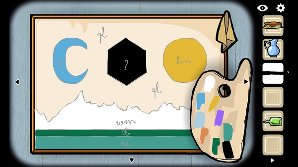 调色盘解谜步骤如下:根据之前收集到的浅蓝/gl、深绿/d、蓝/g、黄/hn、白/wm、绿/na这六组“底色+字母”组合,使用【画笔】蘸取对应的色块颜料,在灰门后的油画草图上进行精准填涂。具体操作时,需先选择对应的颜料罐,再在目标区域轻轻扫过完成涂抹,系统会自动识别颜料饱和度并锁定填色状态。完成上述填涂后,用【黑色颜料】将中央的六边形区域完全覆盖,即可触发【黑方块】的生成。