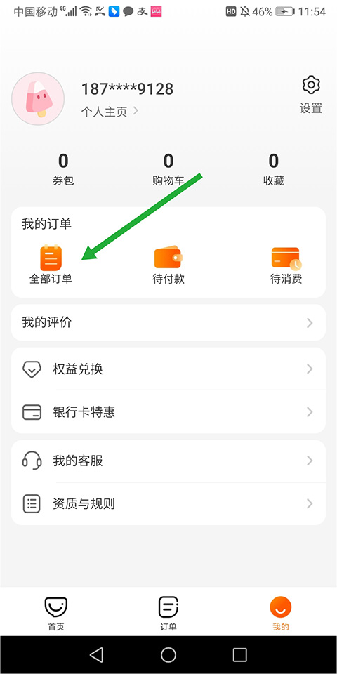口碑APP-【我的】–【全部订单】-点击进入未使用的商品详情页-【查看订单】-【申请退款】