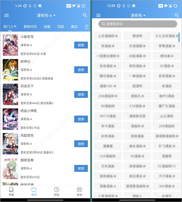 1、点击最上方的“漫画源”可以自行切换推荐页,每一个漫画源推荐的内容、类型都不一样。