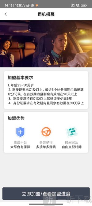 3、进入司机招募界面,这里提供了最基础的加盟要求,符合要求即可点击下方去申请;