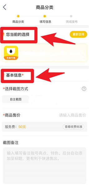 4、发布商品时需选择商品分类并填写基本信息,包括截图方式、售价及备注等内容。