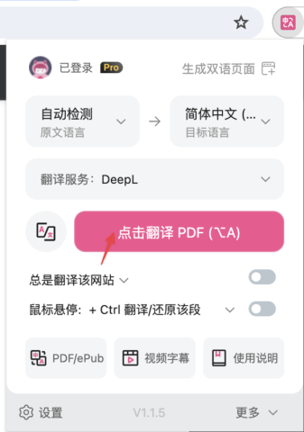 在线的PDF文件,在浏览器中打开后,点击插件图标就能进行翻译;本地PDF文件,则可通过右键菜单选择翻译本地文件。